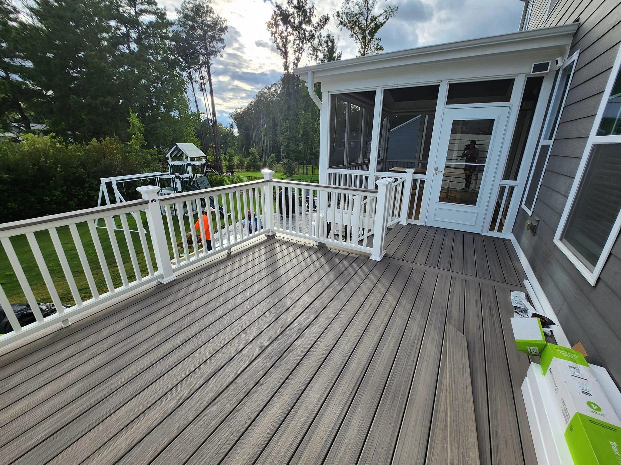 This project exemplifies the ideal combination of functionality and modern design. Built with dark gray PVC decking, this porch offers a beautiful and durable surface that guarantees zero maintenance against moisture, sun, or pests. The installation of multiple, strategically placed skylights and a ceiling fan not only maximizes natural light during the day but also ensures fresh ventilation and a comfortable atmosphere. With a seamlessly integrated outdoor entertainment area, this screened porch is the ideal living space to enjoy the outdoors while remaining protected from insects, without darkening the home’s interior rooms.